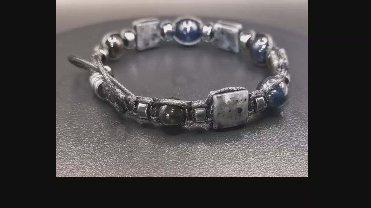 Born from night skies and shifting northern light, this bracelet blends the shimmering whispers of labradorite with the calm gravity of black agate. Hematite’s metallic glow threads through like quiet armour. It is a piece for the man who walks with intuition — steady, grounded, yet always open to the unseen currents. A modern talisman woven in soft black cord, carrying the rhythm of stone, shadow, and light.