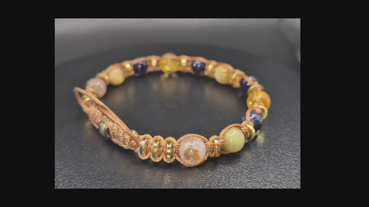 This bracelet channels the energies of Yellow Topaz for clarity, Citrine for positivity, Tiger Eye for courage, Hematite for grounding, and Blue Sandstone for inspiration. A talisman for focus, inner strength, and energetic balance.