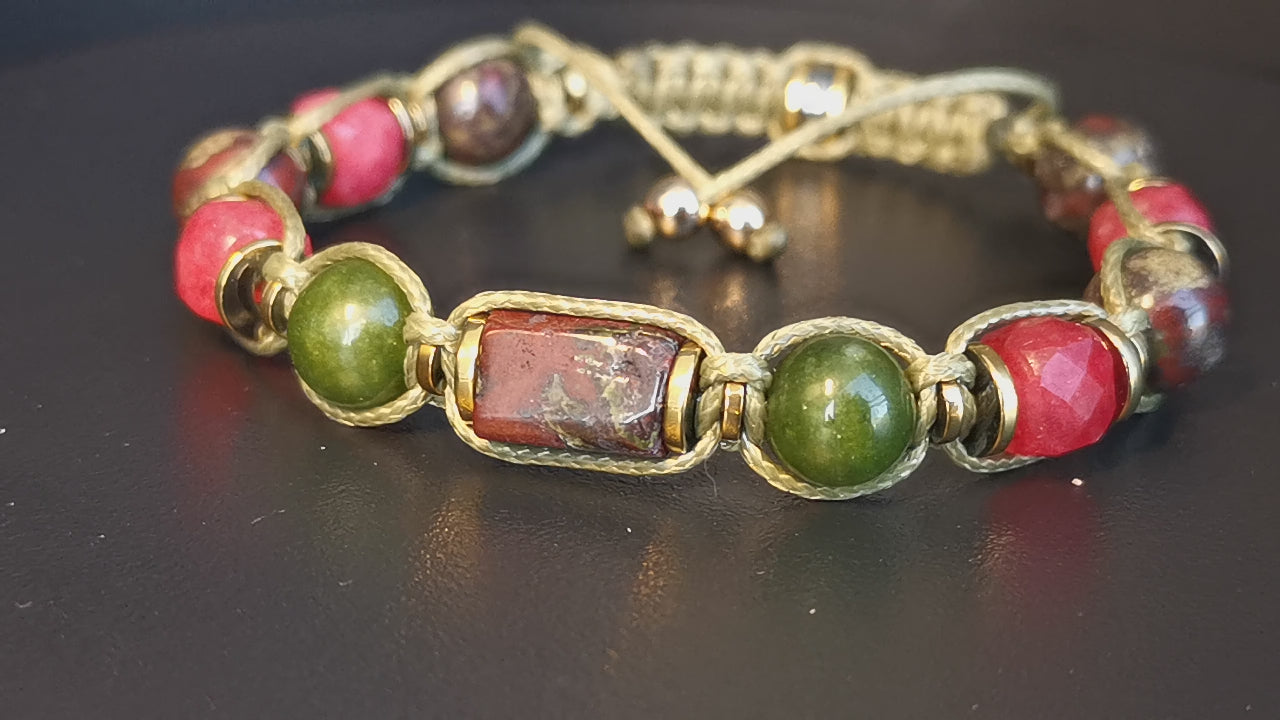 Dragon Blood Jasper glows like embers, Jade hums with calm life, and Red Agate beats with heart’s rhythm.