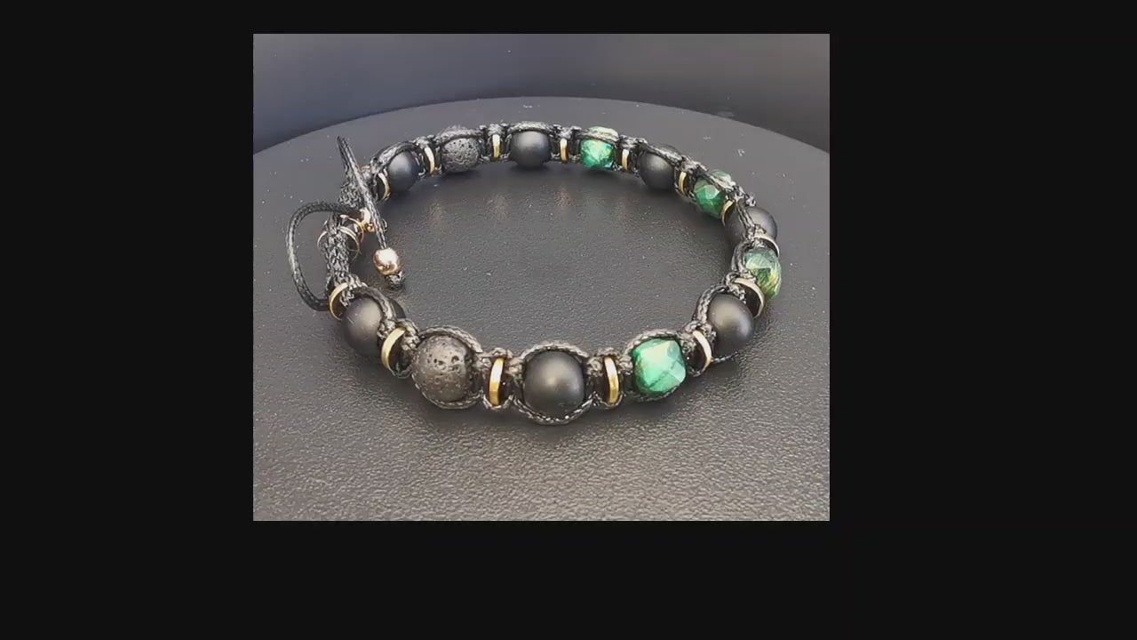 Forged from earth’s raw beauty, this bracelet blends the jungle green of tiger eye, depth of black agate, lava’s fiery essence, and metallic hematite accents. A piece for men who value subtle sophistication, purposeful energy, and natural power.